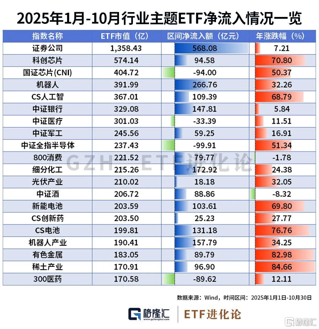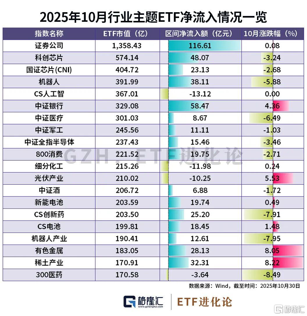 从行业主题指数角度来看,10月,证券公司、中证银行、科创芯片、机器人分别净流入116.61亿元、58.47亿元、48.07亿元、38.11亿元。