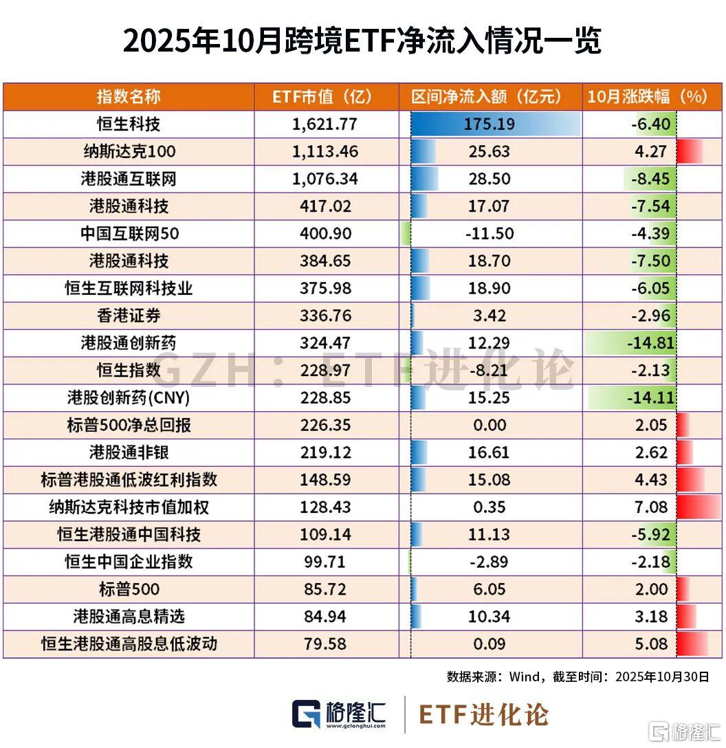 从跨境指数角度来看,10月,恒生科技、港股通互联网、纳斯达克100、恒生互联网科技业分别净流入175.19亿元、28.50亿元、25.63亿元、18.90亿元。
