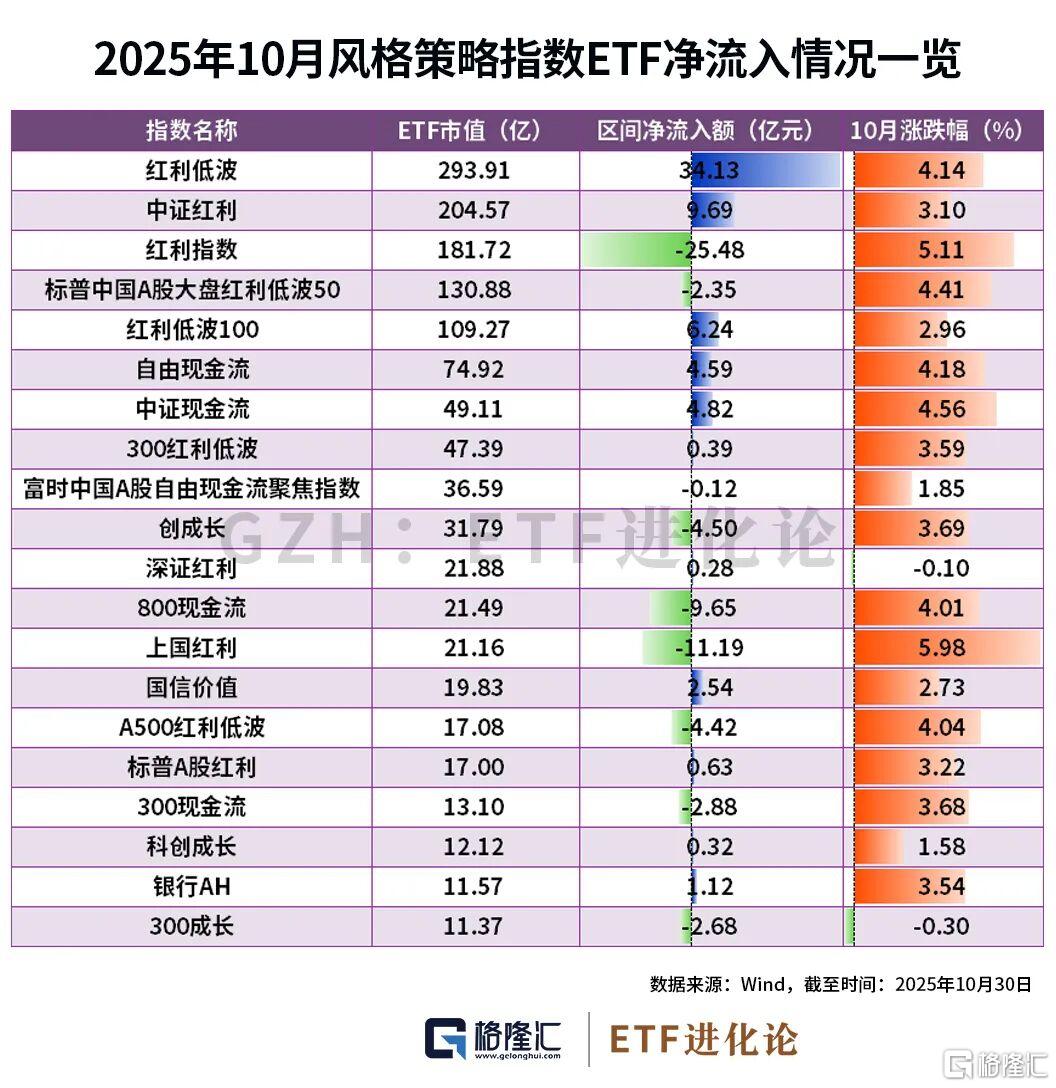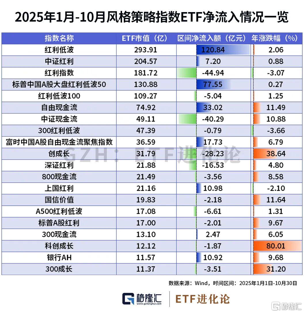 1月-10月,红利低波、标普中国A股大盘红利低波50、自由现金流、富时中国A股自由现金流聚焦指数分别净流入120.84亿元、77.55亿元、33.02亿元、17.73亿元。