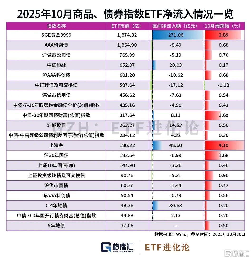 从商品、债券指数角度来看,金价狂飙的10月,SGE黄金9999和上海金分别净流入271.06亿元、48.60亿元。