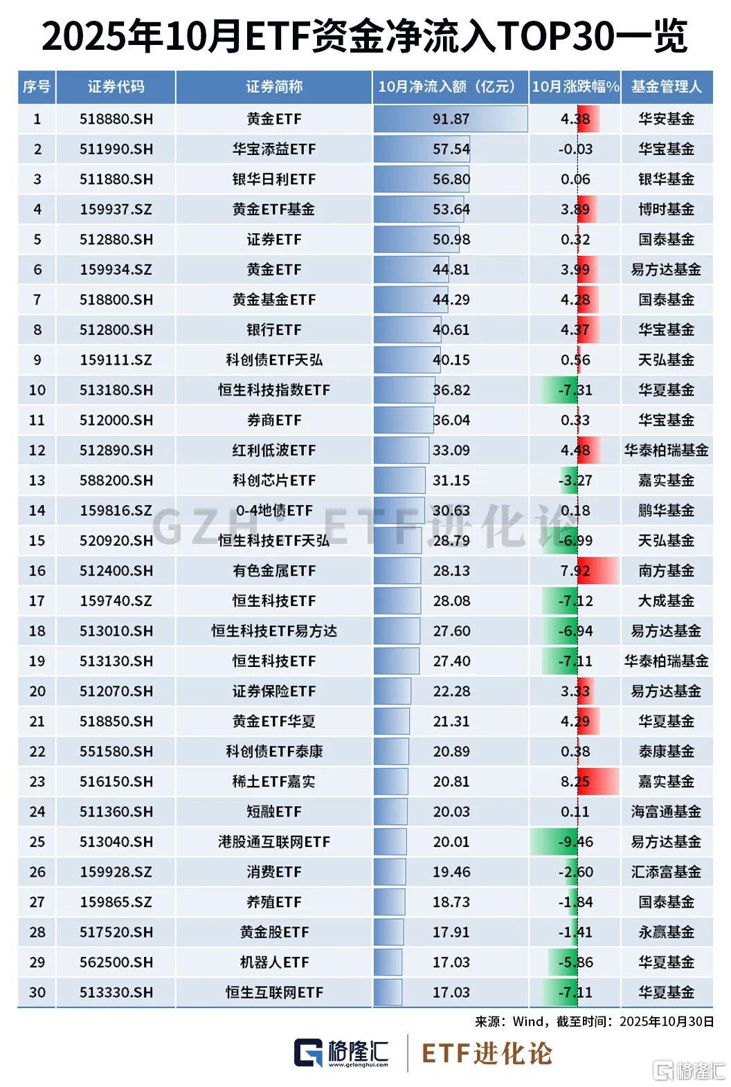 从ETF产品角度来看,10月最受资金青睐的ETF是:黄金ETF、华宝添益ETF、银华日利ETF、黄金ETF基金,分别净流入91.87亿元、57.54亿元、56.80亿元、53.64亿元。