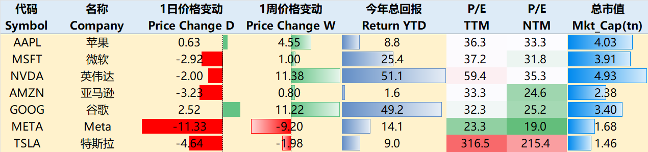 大科技本周也因财报公布表现出分歧,GOOGL、AMZN创下新高但META大幅回落。至10月30日收盘,过去一周 $苹果(AAPL)$ +4.55%, $微软(MSFT)$ +1.0%, $英伟达(NVDA)$ +11.38%, $亚马逊(AMZN)$ +0.8%, $谷歌(GOOG)$ $谷歌A(GOOGL)$ +11.22%, $Meta Platforms, Inc.(META)$ -9.2%, $特斯拉(TSLA)$ -1.98%