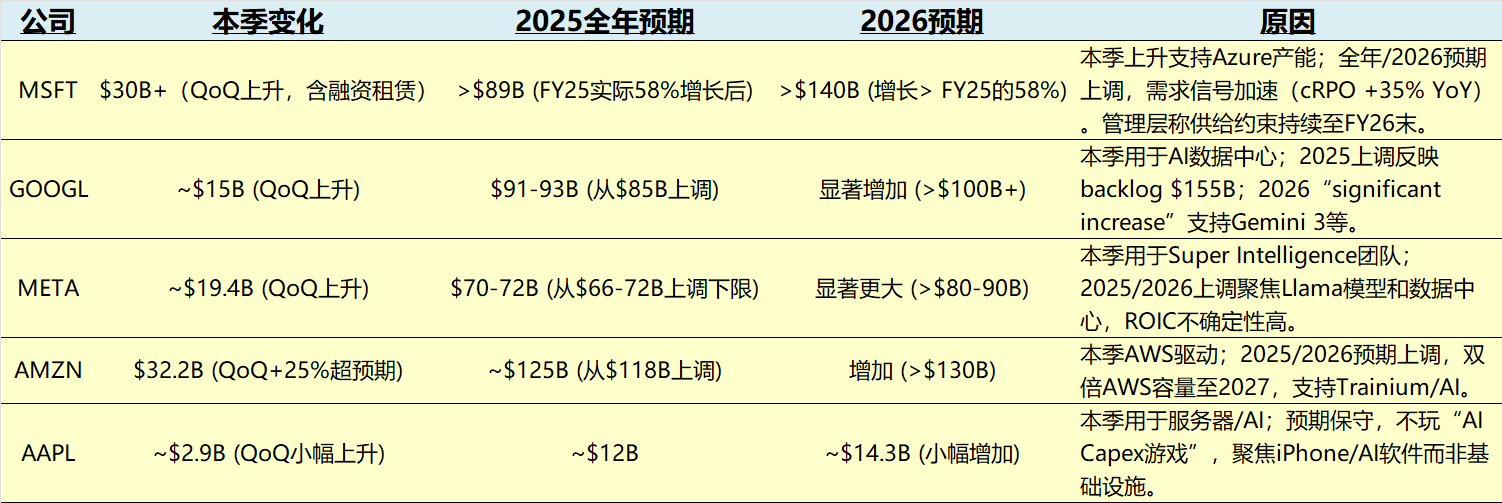 所有公司Q3/FY26 Q1 Capex均上升,反映供给追赶需求。2025全年预期上调,2026进一步增加(除AAPL相对保守)。本季总Capex~$100B+,2025六大玩家的总和可能超过$570B,2026 年目前的预期已经超过$660B(偏向上行),这可是真金白银的现金支出。