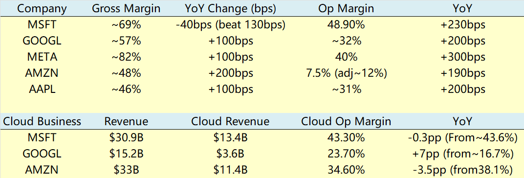 三大云段位margin强劲,但分化——GOOGL GCP margin扩张最快(AI ROIC显现),MSFT稳定(效率抵消投资),AMZN收缩(重投AI基础设施)。剔除后,AI需求推动规模经济,但持续Capex可能进一步压margin(e.g., MSFT供给约束延至FY26末)