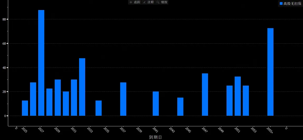 对应上述的Capex预期,AAPL和MSFT目前相对稳健可控,GOOG与META因为Capex投资较多也面临较大压力,AMZN则最为紧张。考虑到2026-2030年AMZN有集中大量的债要到期,很有可能紧接着进一步发债融资。