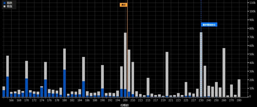 从期权方面看,尽管近期的期权分布并未有太大的变动(11月),财报周(11月21日当周)的Call分布仍大量集中在现价200以下。但是12月到期的期权市场已经把预期抬高至230以上,也反应了当前投资者对年底行情重启的期望。