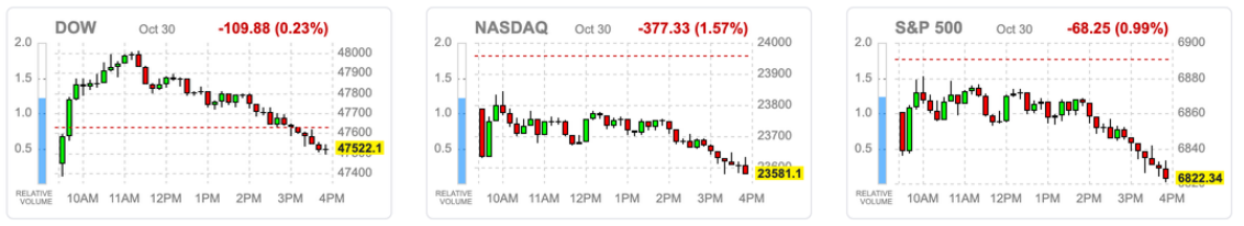 盘中虽有低接买盘支撑,但随着降息预期下降、AI资本开支扩大引发获利疑虑,市场情绪整体转为谨慎。标普500指数收于全日低点,结束连三日涨势。