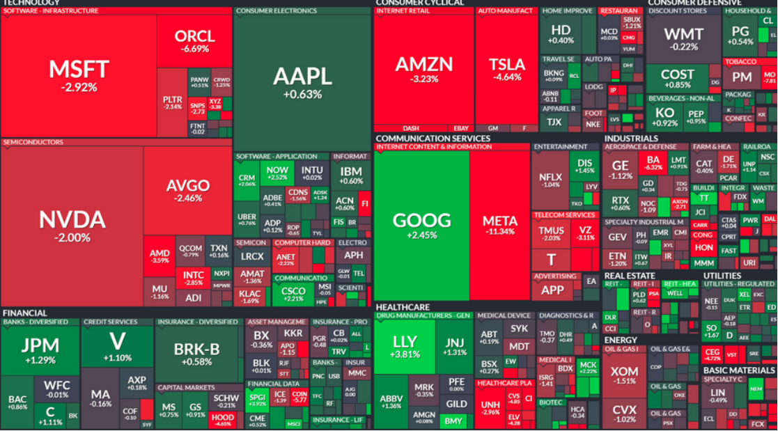 科技七姐妹普遍承压,Meta(META)宣布明年进一步扩大AI资本支出,投资人担忧获利能见度下降,股价暴跌11.3%,拖累亚马逊(AMZN)下挫3.23%。微软(MSFT)因Azure受资料中心产能限制下跌2.9%,谷歌母公司Alphabet(GOOGL)受惠云端与AI需求强劲逆势上涨2.5%,但同样开高走低。