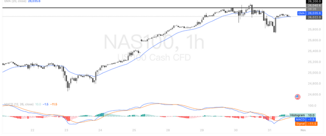 纳斯达克100指数(NAS100)在冲高受阻后进入高位震荡,小时级别EMA20附近反复拉锯,显示短线多空势均力敌。MACD虽由低位开始收敛,但尚未形成明确金叉,动能修复力度有限。上方26,200点为关键阻力位,若能有效突破,将重启上行趋势;若持续受压并跌破26,000点支撑,可能引发短线回调,下方关注25,800区域的防守力度。整体仍处整理区间,等待方向性突破信号。