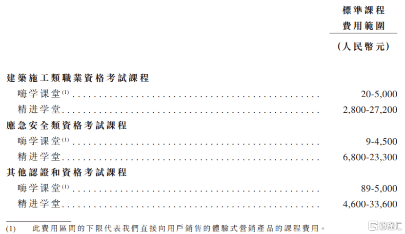 按品牌划分的课程标准费用范围,图片来源于招股书