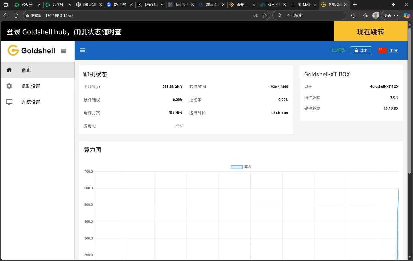 金贝XTBOX 580G 的操作延续了金贝一贯的“傻瓜式”设计,主机搭配一个pin口的静音电源,只需连接电源和网线,登录管理后台即可轻松设置矿池地址和钱包信息。无论是新手还是老矿工,都能在几分钟内完成部署。