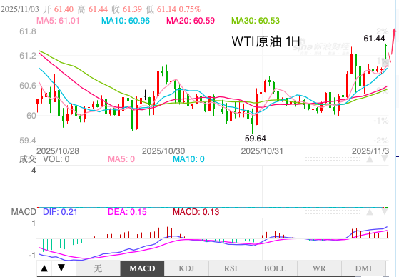 WTI原油周一裂口高开,报61.13美元/桶,欧佩克决定12月增产但明年第一季度暂停增产。油价小幅上扬。