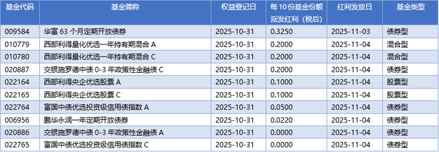 (1)10月31日新发基金共有2只,主要为股票型基金,其中易方达伊塔乌巴西IBOVESPAETF(QDII)募集目标金额达3.00亿元;基金分红10只,多为债券型,派发红利最多的基金是华富63个月定期开放债券型证券投资基金,每10份基金份额派发红利0.3250元。