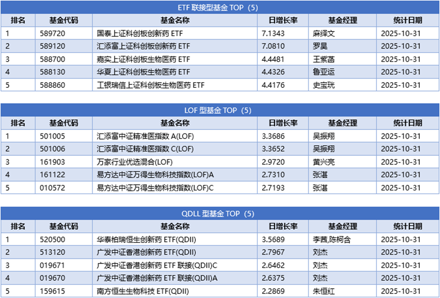 分投资类型看,同样剔除掉分级杠杆及固定收益两类基金的影响,股票型基金冠军为申万菱信医药先锋股票A,日增长率为8.2009%;债券型基金冠军为财通可转债债券A,日增长率为1.1753%;混合型基金冠军为中航优选领航混合C,日增长率为9.8653%;货币型基金冠军为银华交易型货币B,日增长率为0.0091%;ETF联接基金冠军为国泰上证科创板创新药ETF,日增长率为7.1343%;LOF型基金冠军为汇添富中证精准医指数A(LOF),日增长率为3.3686%;QDII基金冠军为华泰柏瑞恒生创新药ETF(QDII),日增长率为3.5689%;下面是不同类型基金日增长率TOP5 (剔除掉分级基金的影响)