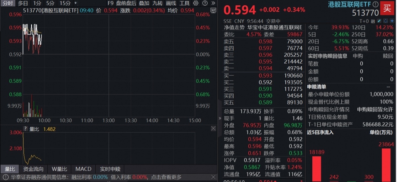 热门ETF方面,重仓互联网龙头的港股互联网ETF(513770)场内价格现涨0.34%,盘中再现宽幅溢价,显示买盘资金态度积极。上交所数据显示,港股互联网ETF(513770)近5日累计获资金净流入4.26亿元。