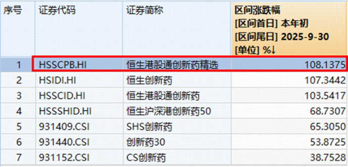 今年以来,恒生港股通创新药精选指数在同类指数中弹性更高,进攻力更强,截至9月底,年内累涨108.14%,领涨一众创新药指数。