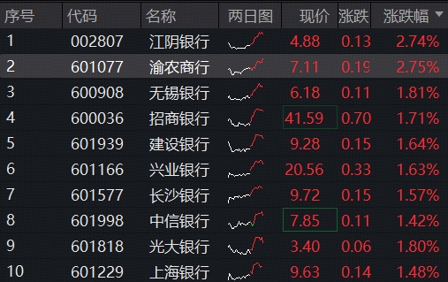 银行股多数走强,渝农商行、江阴银行涨超2%,招商银行、建设银行、工商银行、交通银行等17股涨逾1%。