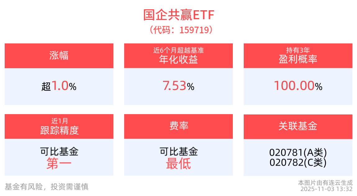 跟踪精度方面,截至2025年10月31日,国企共赢ETF近1月跟踪误差为0.039%,在可比基金中跟踪精度最高。