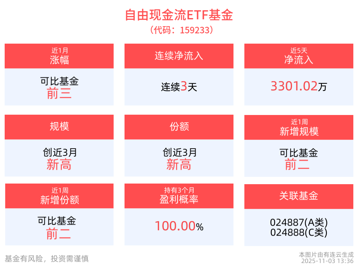 规模方面,自由现金流ETF基金最新规模达3.78亿元,创近3月新高。