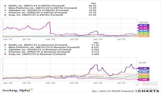 如上所示,Reddit的前瞻EBITDA倍数为46倍,前瞻收入倍数为17倍——这一估值比Meta、谷歌等健康增长的社交媒体及大盘互联网公司高出约一倍,虽然Pinterest和Snap等小盘股也常被用作对比标的,但这些公司近几个季度的用户增长已陷入停滞,因此作为“低价对比标的”的参考意义不大。
