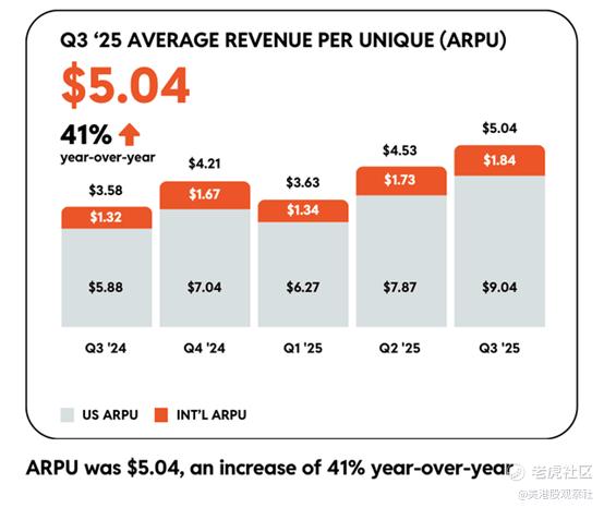 更重要的是,尽管国际用户的ARPU仍低于美国用户,但他们对营收的贡献已开始提升:国际市场ARPU同比增长39%,达到1.84美元。不过,Reddit营收增长的最大驱动力仍是美国市场ARPU——该指标同比飙升54%,达到9.04美元,这一数据也印证了Reddit作为“高转化广告平台”对美国品牌的吸引力。