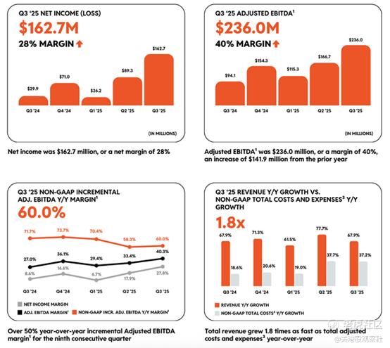 随着业务规模扩大,Reddit已实现显著的规模经济效应。其毛利率本就处于极高水平,Q3又进一步提升90个基点,达到91.0%——这意味着公司每增加1美元营收,几乎全部能转化为净利润。经调整后EBITDA同比增长逾一倍,达到2.36亿美元,利润率为40.3%,同比提升13个百分点。