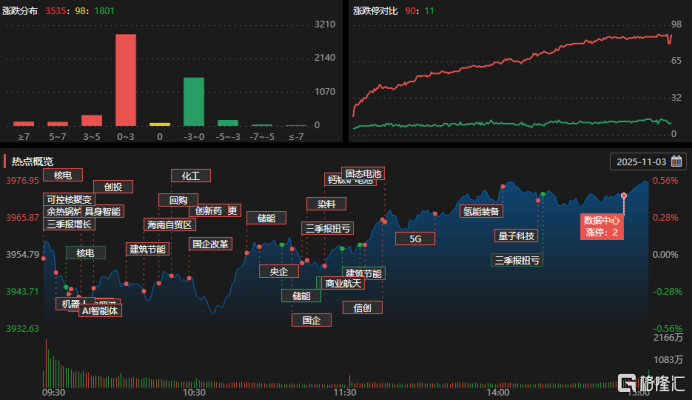 11月3日,沪深两市成交额2.11万亿,较上一个交易日缩量2107亿。板块方面,钍基熔盐概念、AI应用、煤炭、海南自贸区等板块涨幅居前,而小金属、电池等板块下挫。