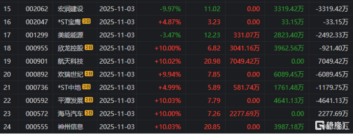 高位股方面,*ST东易20天15板,*ST万方16天13板,ST中迪12连板,平潭发展12天9板,安泰集团13天7板,*ST宝鹰8天7板,ST新华锦6连板,合富中国5连板。