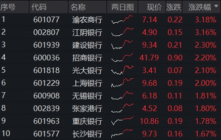 今日沪指探底回升,银行出力不少,中证银行指数收涨1.31%居各行业涨幅前列。个股方面,A股42只银行股40涨2跌,渝农商行、江阴银行涨超3%,建设银行、招商银行等4股涨逾2%,无锡银行、工商银行、中国银行等15股涨超1%。