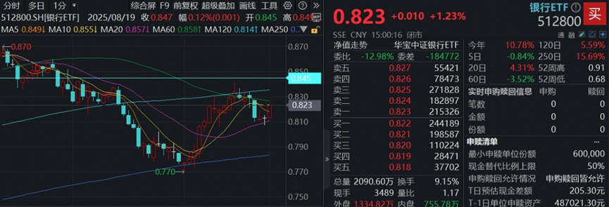 顶流银行ETF(512800)场内价格收涨1.23%,一举收复5日、10日两根均线,全天成交额17.15亿元,环比放量超46%,显示板块情绪显著升温。
