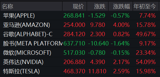 大型科技股成为市场最亮眼的明星。万得美国科技七巨头指数上涨1.04%,其中亚马逊股价大涨4%,收盘报254美元/股,刷新历史新高。公司市值单日增加约1045亿美元(折合人民币约7445亿元),这主要得益于其云计算部门AWS与OpenAI签署的为期七年、价值380亿美元的算力协议。根据协议,AWS将向ChatGPT开发者提供数十万颗英伟达GPU,以支持其模型训练和推理需求。这一合作被视为亚马逊在AI算力市场的重要突破,也强化了其与微软在云计算领域的竞争态势。