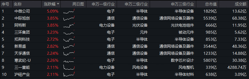 细分方向来看,光模块和半导体携手上攻!光模块三巨头方面,中际旭创涨超3%,新易盛、天孚通信涨逾2%;半导体龙头方面,中微公司涨超5%,寒武纪涨逾2%;光伏龙头阿特斯涨超3%,亦有亮眼表现。