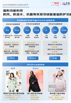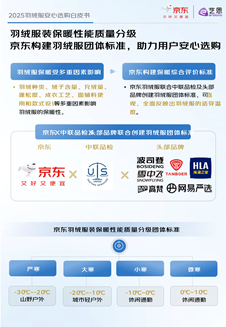 因羽绒服的保暖性能受多重因素影响,消费者在选购时往往难以直观判断其实际保暖效果。对此,京东服饰联合中联品检机构,以及波司登、海澜之家、高梵、雪中飞、坦博尔、网易严选等服饰大牌,共同制定“羽绒服装保暖性能质量分级” 团体标准。该标准通过建立一整套综合评价体系,将羽绒服的保暖标准按照温度科学划分为“微寒、小寒、大寒、严寒”四个明确等级,可直观、全面反映出羽绒服的适穿温度。同时每个等级均提供清晰的参数建议与代表性商品,让消费者能够轻松匹配自身的使用场景和需求,实现精准选购。