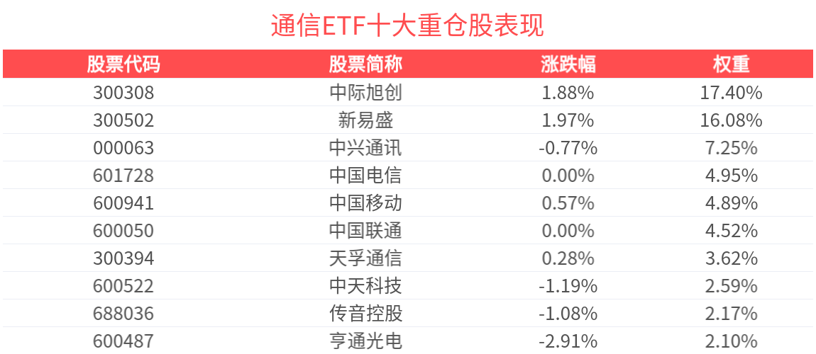 数据显示,截至2025年10月31日,国证通信指数前十大权重股分别为中际旭创、新易盛、中兴通讯、中国电信、中国移动、中国联通、天孚通信、中天科技、亨通光电、闻泰科技,前十大权重股合计占比66.96%。