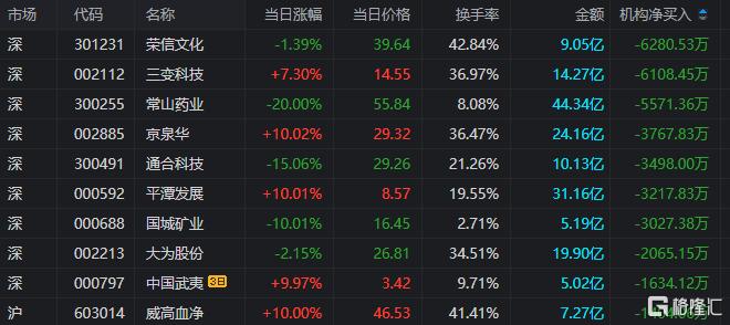 龙虎榜中涉及机构专用席位的个股中,当日净卖出额前三为荣信文化、三变科技、常山药业,分别为6280.53万元、6108.45万元、5571.36万元。