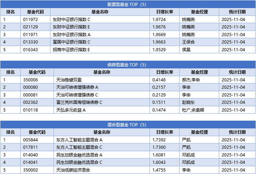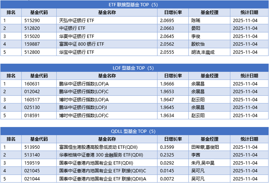 单基金方面,剔除掉 创新封基类型 基金的影响,11月04日业绩表现最好的基金为天弘中证银行ETF,日增长率为2.0695%,其次为中证银行ETF,日增长率为2.0663%、华夏中证银行ETF,日增长率为2.0645%。
