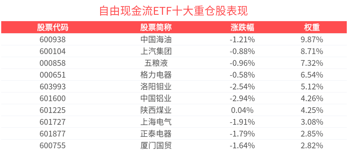 自由现金流ETF(159201)紧密跟踪国证自由现金流指数,数据显示,截至2025年10月31日,国证自由现金流指数(980092)前十大权重股分别为中国海油、上汽集团、五粮液、格力电器、洛阳钼业、中国铝业、陕西煤业、上海电气、厦门国贸和正泰电器,前十大权重股合计占比54.79%。