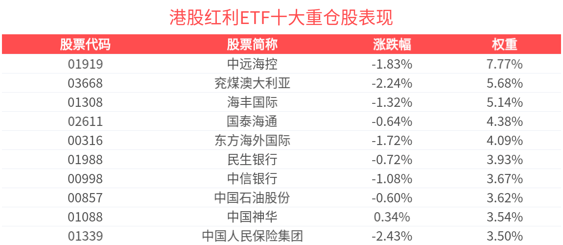 数据显示,截至2025年10月31日,中证港股通高股息投资指数前十大权重股分别为中远海控、兖煤澳大利亚、海丰国际、东方海外国际、中国石油股份、中信银行、国泰海通、中国神华、民生银行、中国人民保险集团,前十大权重股合计占比46.3%。