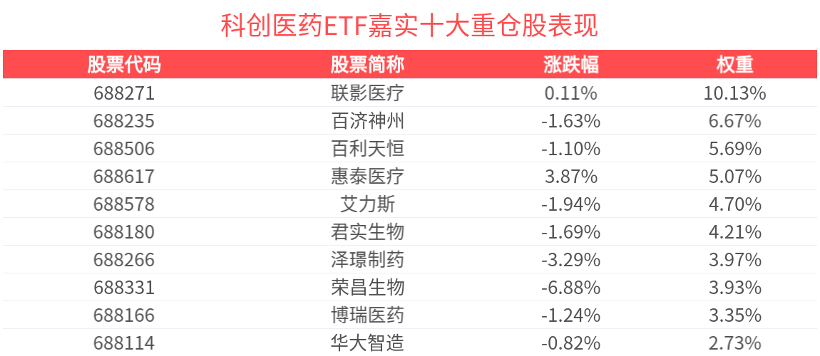 数据显示,截至2025年10月31日,上证科创板生物医药指数前十大权重股分别为联影医疗、百济神州、百利天恒、艾力斯、惠泰医疗、君实生物、泽璟制药、荣昌生物、博瑞医药、奕瑞科技,前十大权重股合计占比49.74%。
