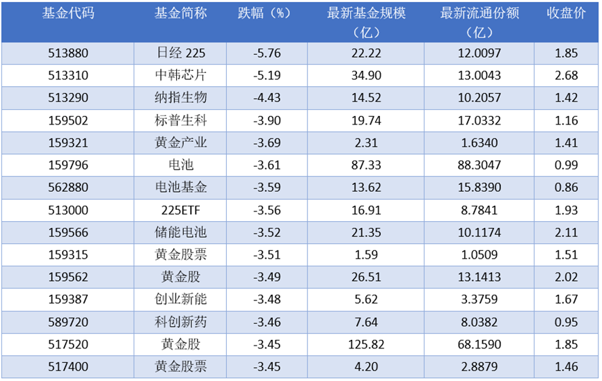 下跌方面,2025年11月04日跌幅最大的是日经225 (513880),跌幅达到5.76%。排名靠前的中韩芯片(513310)、纳指生物(513290)、标普生科(159502),跌幅分别为5.19%、4.43%、3.90%。