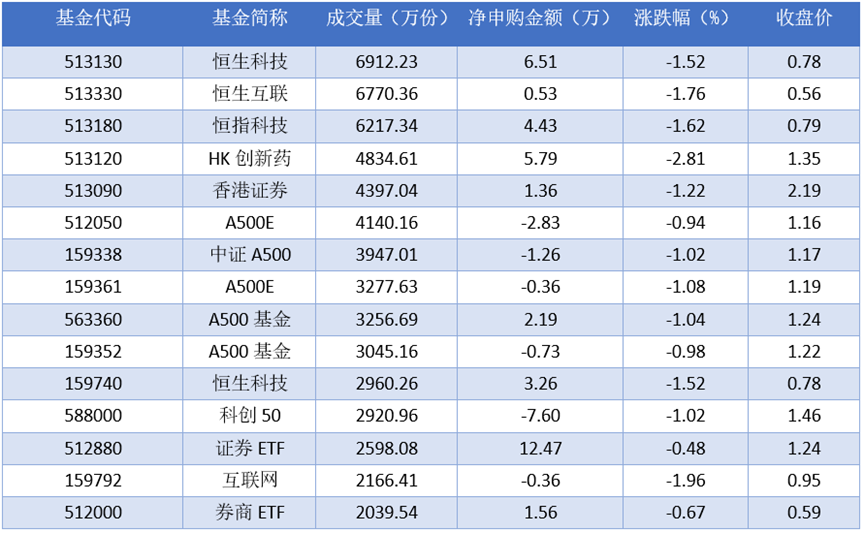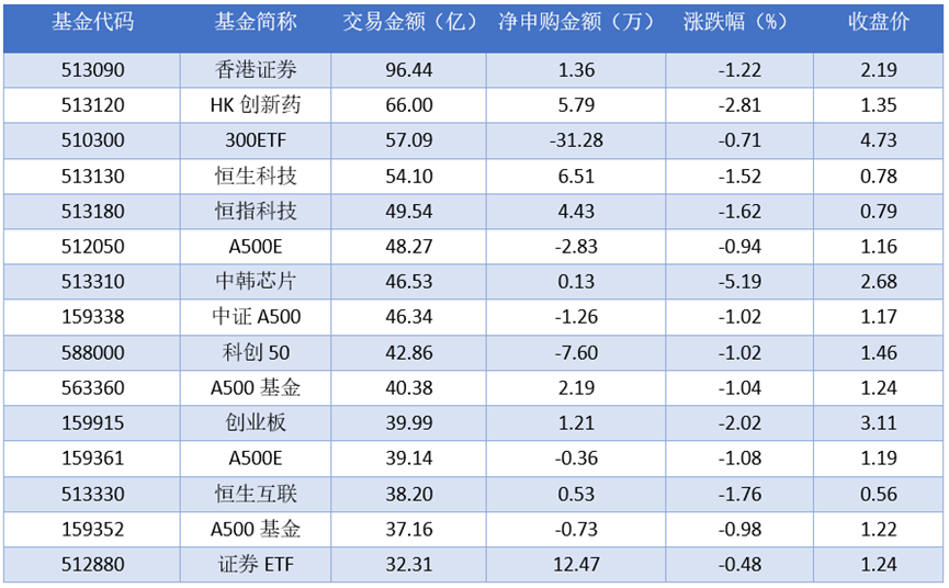 从成交金额上来看,2025年11月04日成交额最大的是香港证券(513090),交易金额96.44亿元。排名靠前的HK创新药(513120)、300ETF (510300)、恒生科技(513130),成交额分别为66.00亿元、57.09亿元、54.10亿元。