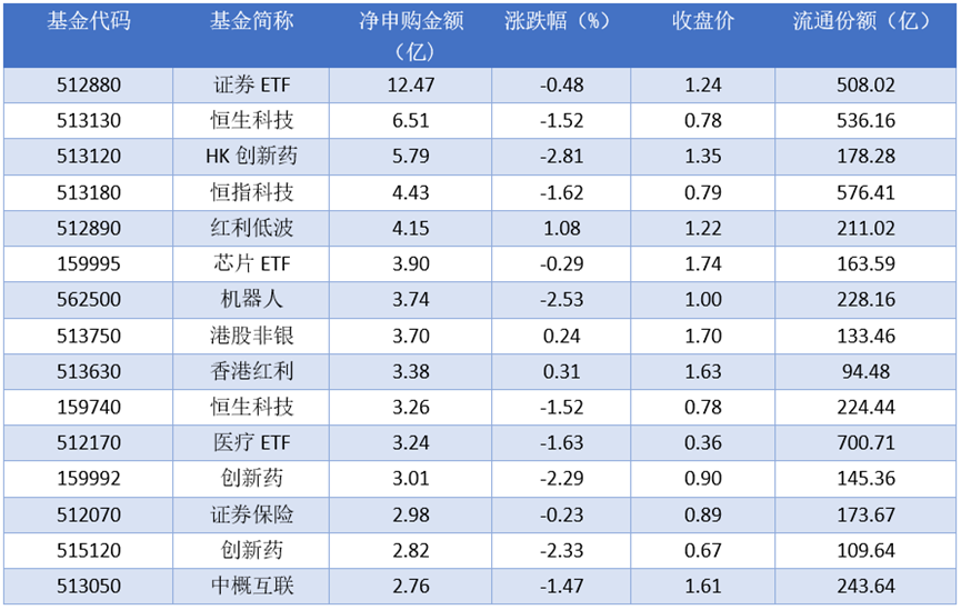 细分到资金流动情况上来看,2025年11月04日净申购金额最大的为证券ETF (512880),当日净申购金额为12.47亿元。排名靠前的恒生科技(513130)、HK创新药(513120)、恒指科技(513180),申购金额为6.51亿元、5.79亿元、4.43亿元。