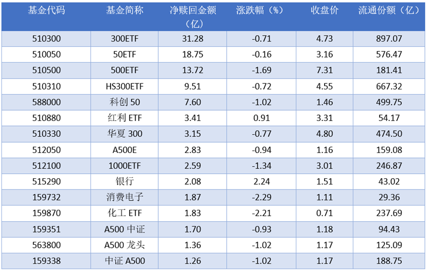 资金流出方面,2025年11月04日净赎回金额最多的是300ETF(510300),赎回金额31.28亿元。排名靠前的50ETF(510050)、500ETF(510500)、HS300ETF(510310),赎回金额分别为18.75亿元、13.72亿元、9.51亿元。