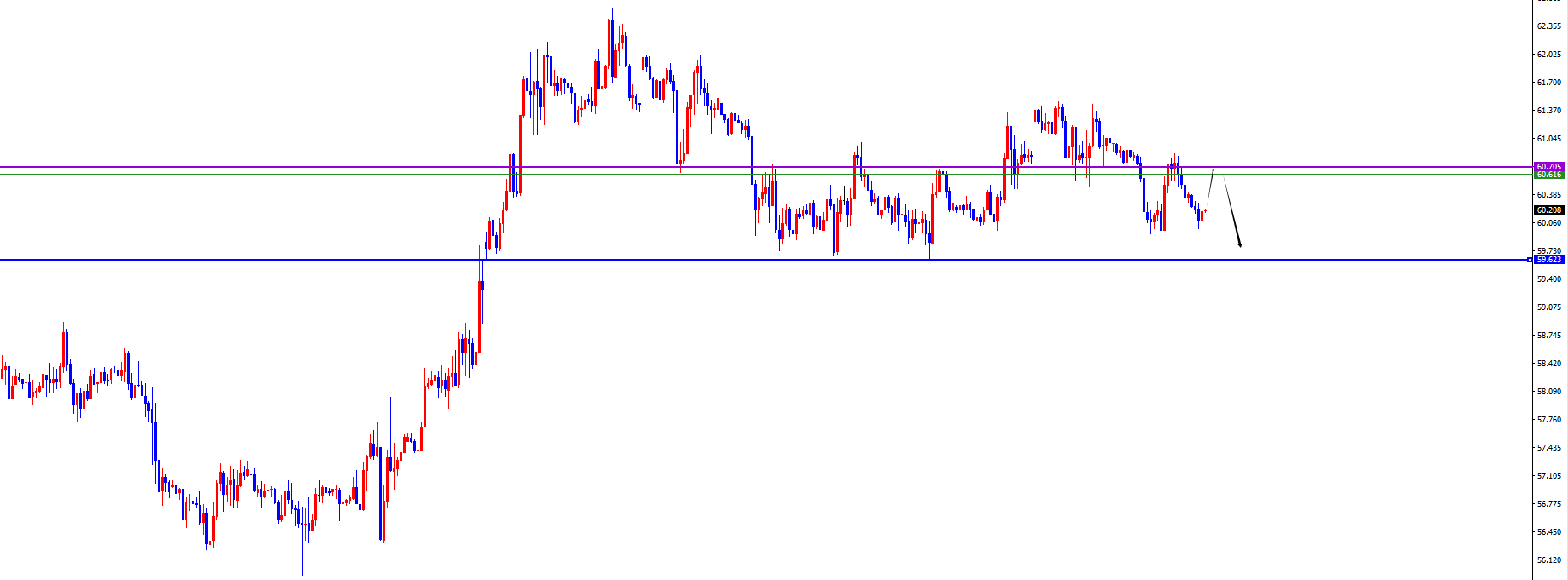 整体上目前处于59.60-61.50区间震荡,打破区间才会发力