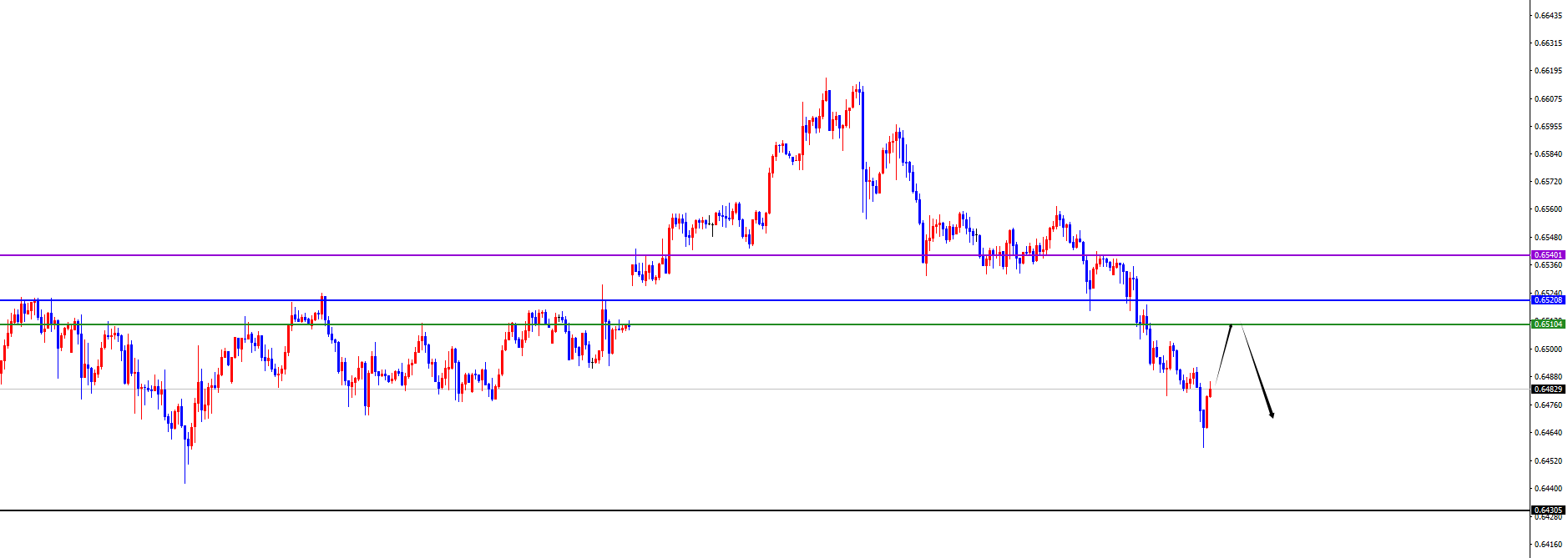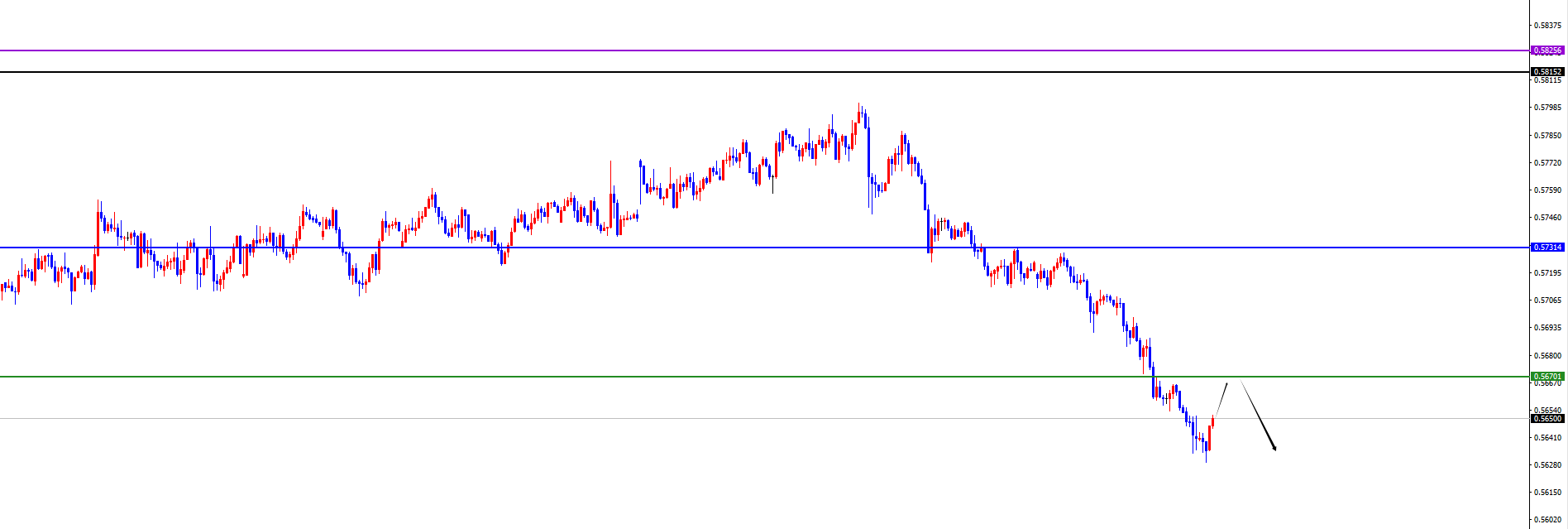 关键分水岭0.5700位置,价格上破之前维持空对待