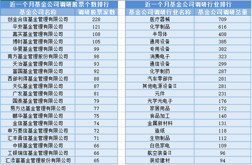 近一个月(10月6日-11月5日),创金合信基金参与公司调研的数量最多,共调研228家上市公司,然后调研较为活跃的还有平安基金、嘉实基金和博时基金,分别调研121家、108家、105家上市公司;从调研行业上来看,基金公司对医疗器械行业的上市公司调研次数最多,共有709次,其次是化学制品行业,基金公司调研了616次。