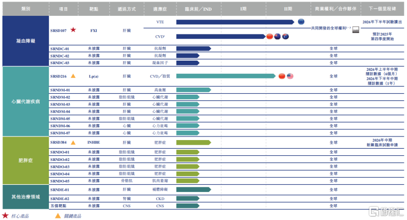 SRSD107作为公司的核心产品,是一款潜在同类首创的靶向凝血因子XI的siRNA药物,目前正于欧洲开展II期多中心临床试验,并计划在中国及澳大利亚╱新西兰启动另一个II期试验;该产品通过与CRISPR Therapeutics(纳斯达克:CRSP)建立的全球共同开发及商业化合作推进。