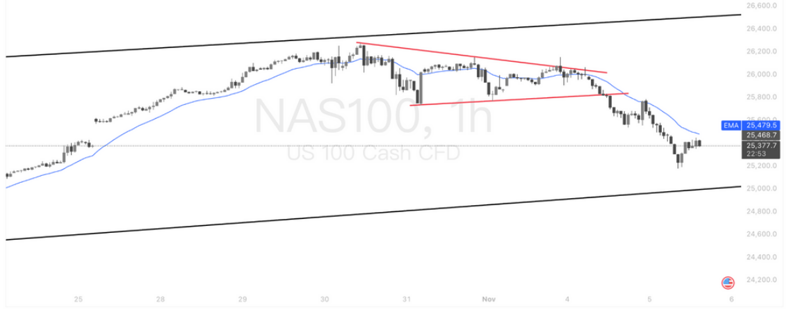 纳斯达克100指数在经历连续上涨后,于高位形成收敛三角形(红线),随后向下跌破支撑并持续走弱。目前价格运行在20周期EMA(蓝线)下方,显示短线动能仍偏空。若无法有效收复25,480一线,空方压力将维持,指数有机会进一步回测下方趋势通道支撑约25,000点区域。短期关注反弹乏力后的再度下探机会,除非强势突破EMA并重新站稳25,600上方,否则趋势偏弱格局不变。