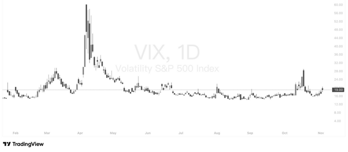 尽管全球股市出现明显回调,VIX指数仅小幅反弹约10%,至19附近,显示市场整体避险情绪依然温和。相较于4月与10月高波动时期的急剧飙升,本轮波动率反应明显偏弱,反映出投资人对风险事件的预期可控,以及系统性抛售情绪尚未形成。若VIX持续受限于20以下区间,意味着当前下跌或仍属技术性调整,而非恐慌性抛售。但若后续突破22–24区间,才可能引发更深层的避险浪潮。
