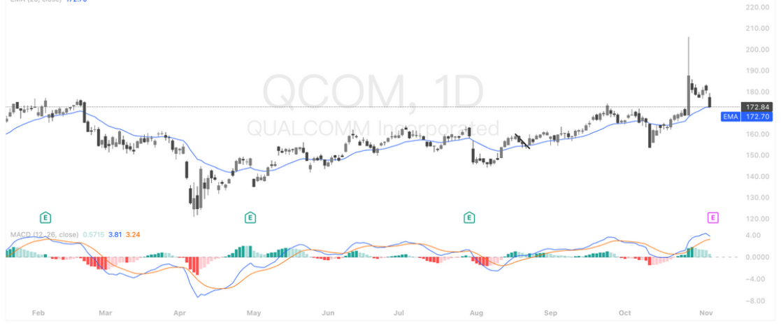 技术面上,高通(QCOM)股价近期呈现震荡上行趋势,自年初以来经历了一轮深幅回调后逐步企稳反弹,当前价格在172美元附近运行,短期均线(如20日EMA)呈多头排列,显示上涨动能仍在延续。MACD指标金叉且柱状体转正,反映市场买盘力量增强,技术面整体偏强。尽管近日出现小幅回落,但未跌破关键支撑位,若后续能站稳170美元上方并放量突破前高,则有望开启新一轮上涨行情。